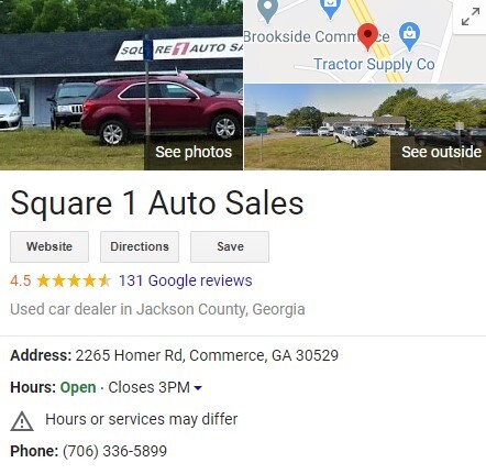 Square 1 Auto Sales is proud to be a member of the Commerce & Gainesville, GA business community and to bring one of the greatest selections of used automobiles in the region. Our entire team is dedicated to meeting the needs of our customers in every way possible, changing the way you approach the automotive shopping process, and helping you get into the right vehicle for you and your family with affordable, flexible financing options.